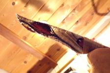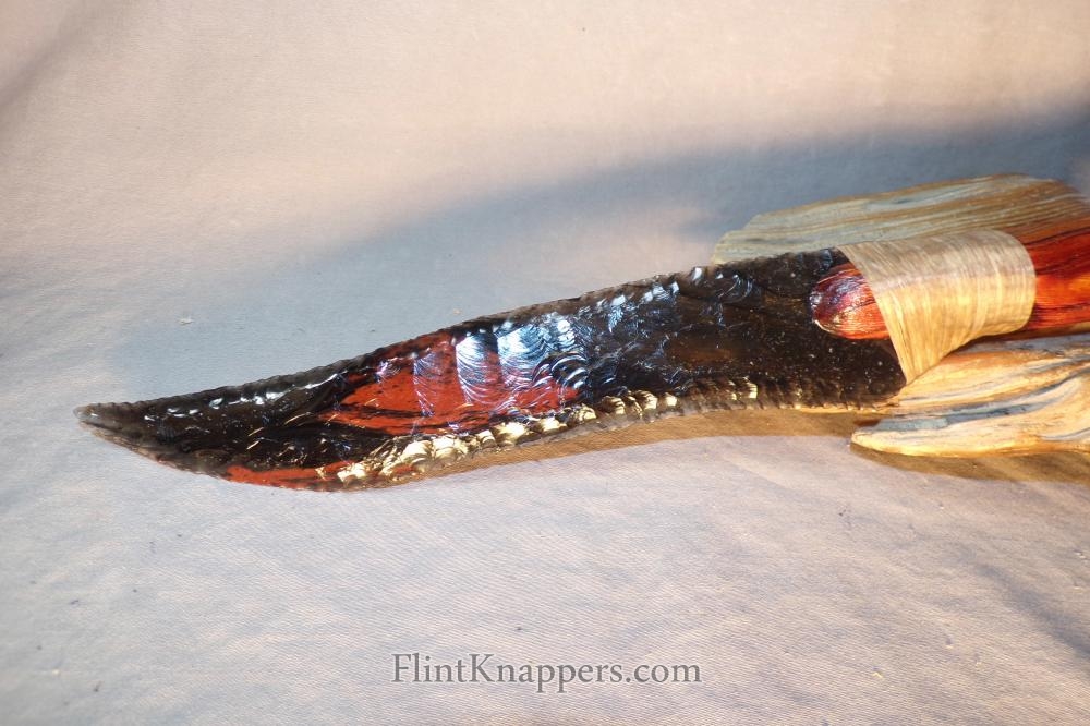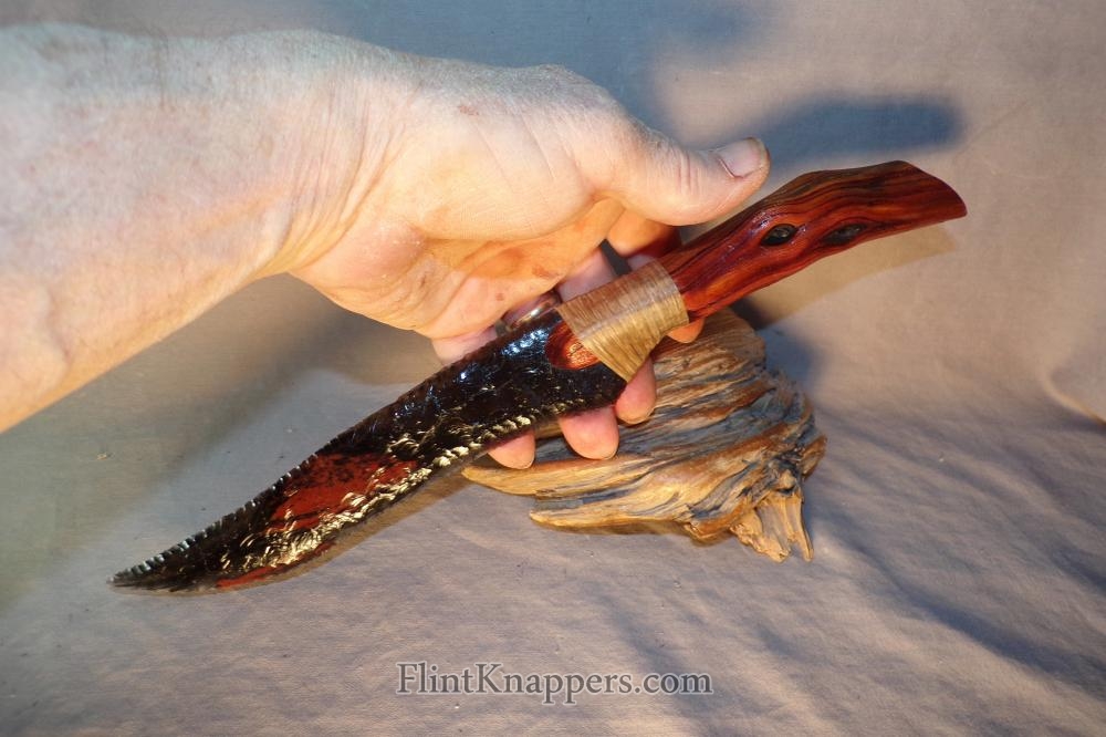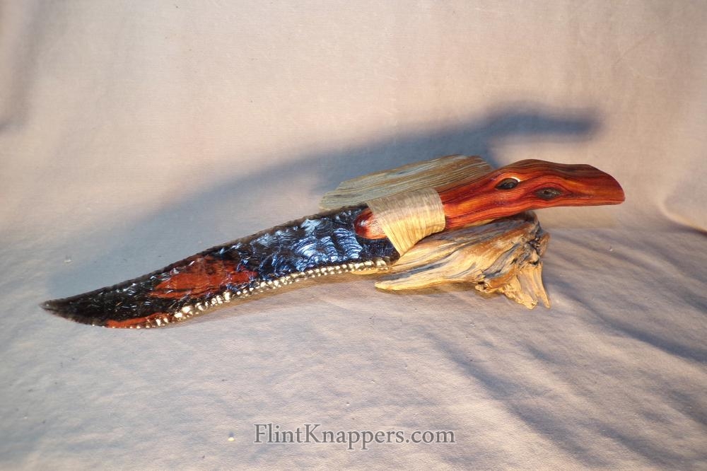 This nice knife is 12 1/2 inches long measured straight and this unique blade has been knapped out of a triple flow obsidian. This handle is a very unique piece of manzanita, stained and finished. Very nice and Unique. This knife does come with a notched manzanita piece.