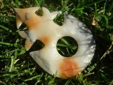 Color, color, color. This nice Mayan Eccentric is from a piece of white, with orange and black, Novaculite. It was knapped by Bob Thomas, master flint knapper, Sept, 2012. |