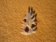 A nice petite Mayan Eccentric, by master flint knapper, Bob Thomas. It resembles a Mayan figure with headdress. It's made from light purple Burlington. Knapped Sept, 2012. |