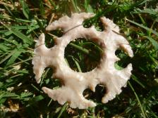 A really nice Virgil Tonn ring Eccentric. Virgil Tonn is a master flint knapper from Texas. The eccentric is made from light tan Texas river gravel. Knapped Mar, 2001. Signed: VT |