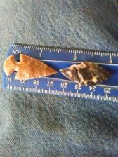 The wood point is a variety of a Sandia point but this one has a tip on stem,the corner notch is of chert or jasper,I think it was packed into mcelmo because it was the only flake I found.both nice rare points. Thanks for your time and have a good day. |