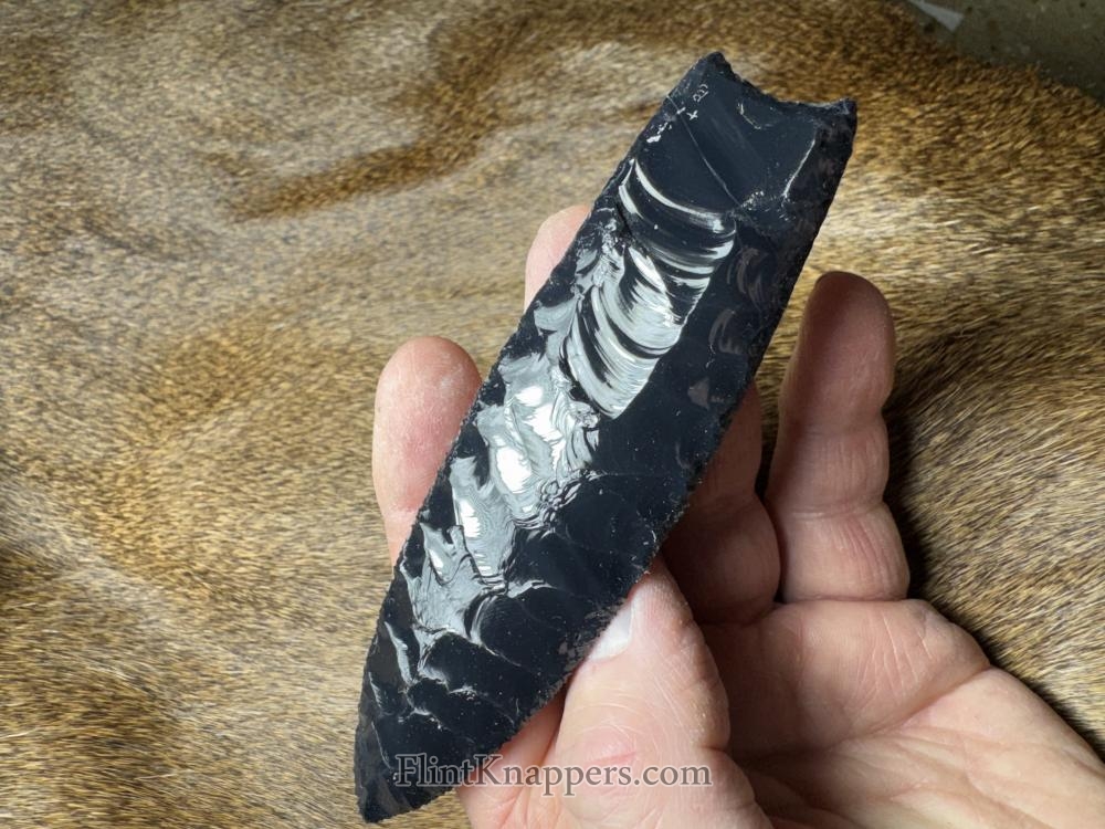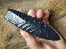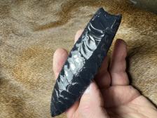 Made from beautiful DARK blue obsidian from Mexico! Serrated sharp with a nice chevron flaking pattern! Hafting area is ground, thanks for looking! |