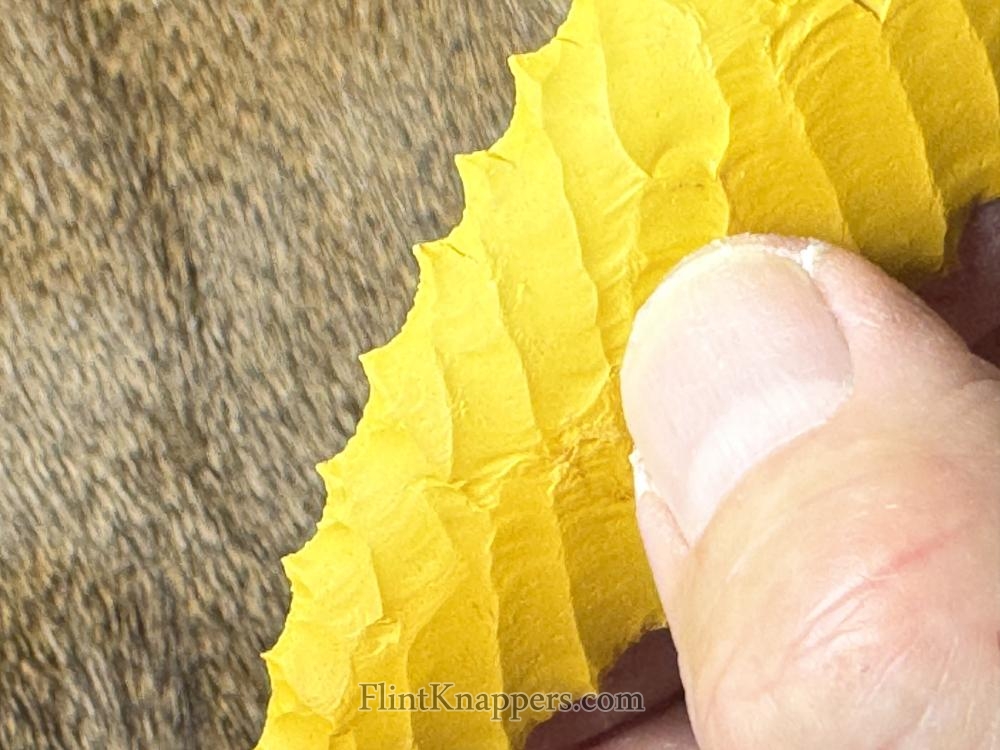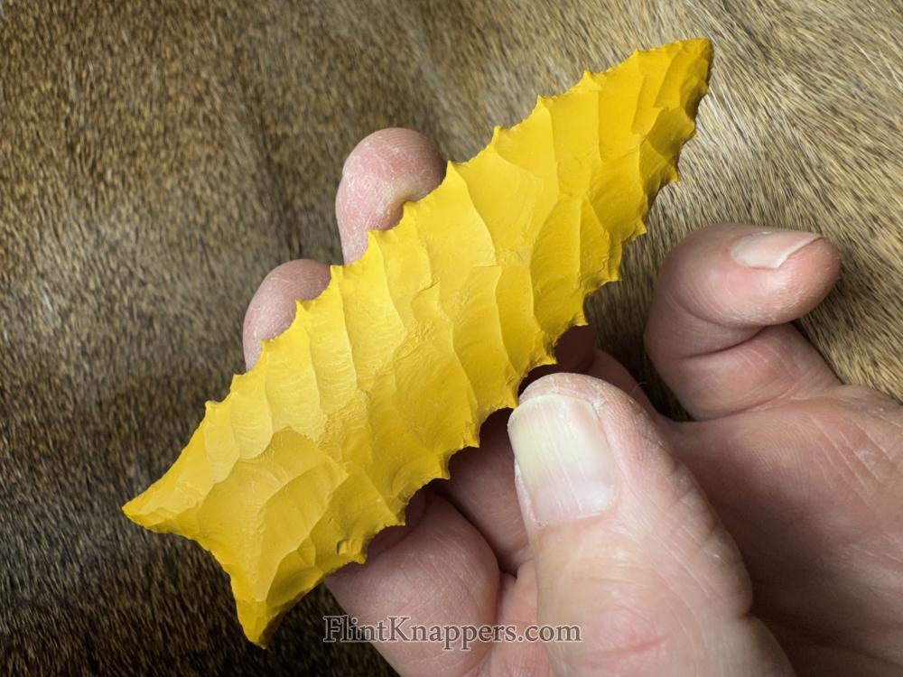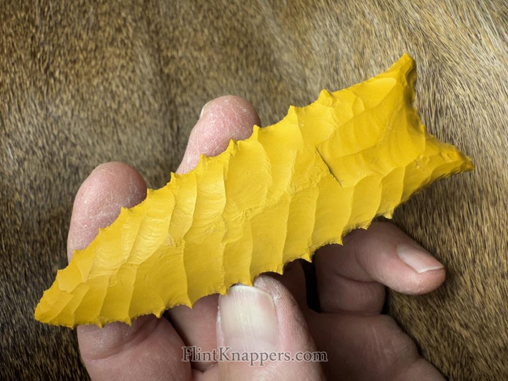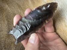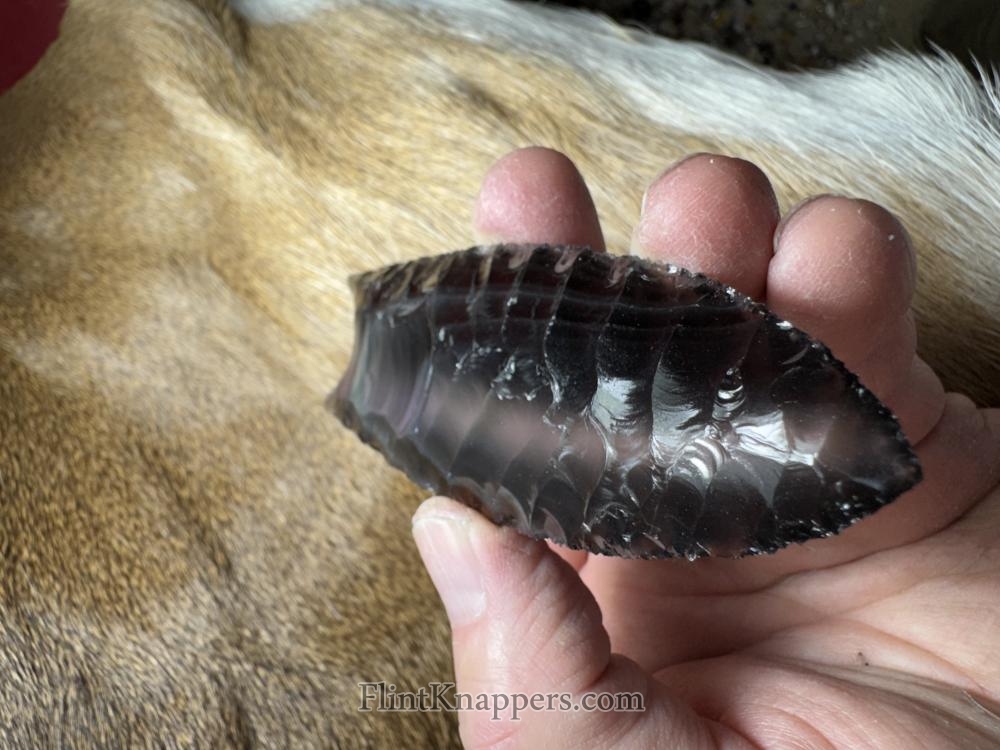 Made from a VERY dark blue obsidian from Mexico! Serrated sharp with a nice flaking pattern and a little bit of spider web lines at the tip! Hafting area is ground, thanks for looking! |