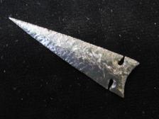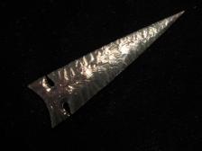 This Ishi point is made out of a piece of Mexican Rainbow Obsidian I found tucked away in my shop. Its VERY hard to catch the color in the photos but its green on both sides with a bit of purple on one side near the base. Sunlight would have been best to photograph this in but its been snowing here all day! The flash caught some of it but still doesn't do it justice. Ishi style expanding notches based on one he made that I've been able to handle and photograph. |