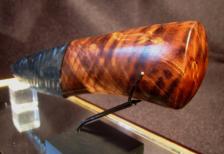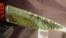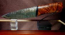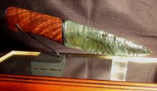 Beautiful knife made of brilliant rainbow obsidian from Jalisco, Mexico. Handle is made of highly polished iridescent maple hardwood accented with ebony. A flashy show knife deluxe.