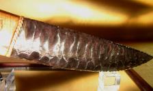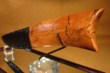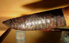 Rare and expensive Mexican velvet obsidian in deep purple with wisps of teal. Very nice ripple flaking. Set into a highly polished spalted quilted maple handle and finished with braided waxed flax cordage.