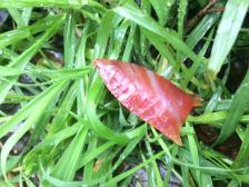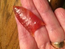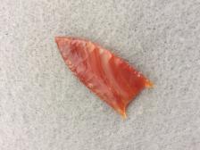 A beautiful Brazilian agate Midland, knapped and signed by Virgil Tonn. The Midland is translucent with curved bands of orange. Nice parallel flaking. Virgil Tonn is a well-known, excellent flint knapper from Texas. Knapped Jun, 2003. Signed: VT 3 |