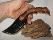 This is a beautiful, one of a kind, knife. It is 9 1/2 inches long measured straight and this nicely curved blade has been knapped out of a nice midnight lace Obsidian with a small spot of red. The handle is a nicely curved Black tail deer Antler with quite a bit of character.
