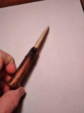 Here is a miniature knife made to look like a paleo knife, the blade is Keokuk and the handle is beech.. Securely hafted and lashed with rawhide this little blade is functional and measures 5 3/4" overall |