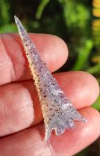 Montana Agate is one of my favorite stones to flintknap! I love it's translucent, waxy look, and the black manganese spots or dendrites floating within the stone. The long drawn out fine tip and fine serrations only add to this arrowheads beauty. I signed and dated it using a diamond tipped scribe. Enjoy!
