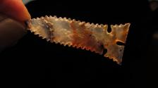 This is one of those 'Mound 72" style Cahokia points made out of some colorful Montana agate. For some reason this piece of rock was very inconsistent stuff to work so it fought me all the way. But I won. |