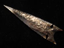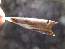 This nice Crump Lake style Northern Side Notch is made from a piece of clear and chocolate brown streaked Montana Agate. Expanding notches fine tip and full serrated edge all the way to the end of its 'fox ear' style base. I've seen originals that were made as well as this one. |