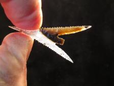 Nice clear and dark Gunther point made out of Montana agate with extra long barbs and a bit of asymmetry to it which is how many of the old points were. Long barbs and fine serrations with a needle tip. I've actually seen old ones like this that still had pitch on the point proving they were once hafted. |