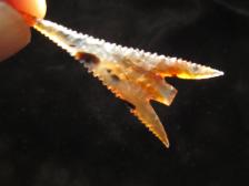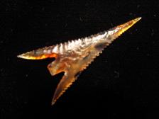 This sleek Gunther point is made out of a really nice piece of Montana agate with clear, orange, black streaks in it. Montana agate this nice is hard to come by. This point has long barbs, a needle tip and fine serrations. This one is about as good as they come. Happy Thanksgiving everyone! |