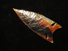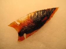 This is a really really beautiful piece of Montana agate of a color combo that just doesn't show up very much. Bright orange and blackish streaking in it. It flaked more like cranky Brazilian agate but its def. Montana. I decided the best way to utilize this piece was to make this Northern Side Notch point out of it with serrated edges and expanding notches. Turned out well I think. Don't anyone ask for another one like it because I don't have anymore material like it! |