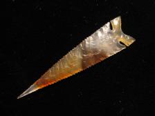 This nice Wintu style point is made from a piece of Montana agate. Narrow entry expanded notches and a sleekness of form a lot of the old well made Wintu points once had. I can't seem to keep many of these in stock these days. |