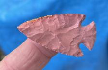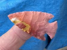 A sweet colored point made from pinkish mookite material with a mustard spot on one side. |