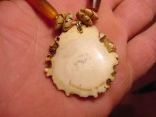 offered here is a very beautiful antler carving of a moon/star, the carving is on a natural deer antler crown, I drilled a small hole and included a brown leather cord so it is ready to wear as soon as you open your package. Signed Bonecarver and numbered.