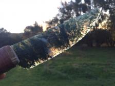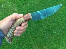 A vintage Carney (early years) dark moss agate blade hafted to a heavily beaded Idaho Mule shed.