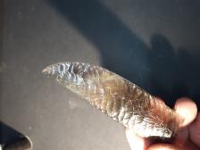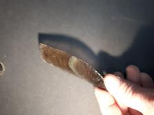 This is a pretty colored blade. The rainbow colors are more mottled than banded, but it's a beautifully colored piece. Prescision flaking and edgework and thin sharp edge. Mount to the handle of your choice. 4 1/2 x 1 1/4 inches