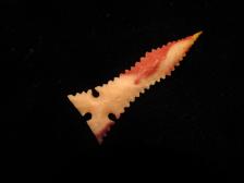 This is one of those serrated Mound 72 style points that looks like someone put a corset in the middle of it and pulled the strings as tight as they would go. This one is made out of a colorful piece of mookite jasper, creamy white with red dressing around the tip and edges. The bit of color on the base is more of a purple red |