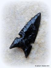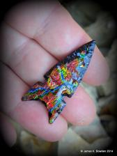 This arrowhead will grab anyone's attention with its sparkling metallic colors.  It reminds me of a blue lightening strike running through a red sunset.  As with all my flintknapped work, this one is signed and dated using a diamond tipped scribe.  I dulled the edges and tip so that it could be incorporated as a necklace pendant.  This piece is also reversible (one side with the flashy color, and the other side with a shiny black obsidian-like look).