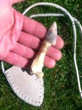 Turkey wing bone handle with a Flintridge Nethers blade hafted with real sinew and hide glue and coated with hide glue and bees wax and a heavy leather hand sewn sheathe. Sheathe is not adjustable but big enough for an adult.