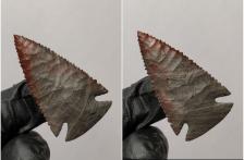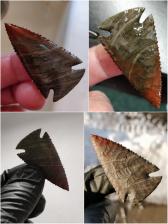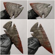Nice Corner Notch point in Nethers Flint. Lean with Good flaking and balance. This Flint has awesome banding that resembles agate banding, and this particular piece has an awesome blood red coloration at the tip and along the edges! Not only is the color right for blood, but the red has a slightly higher luster then the rest of the Flint, giving the impression of being semi-wet. Almost like it's been freshly recovered from the kill! Really neat if you ask me.