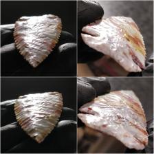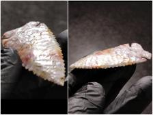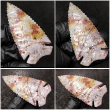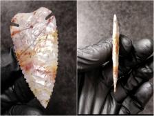 Awesome Nevada Jasper Bifurcated Corner Notch point! Clean flaking, good balance, double serrated edge work, in beautifully colored Nevada Jasper. Very high luster, and smooth flake scars to boot. Very cool healed fractures on the surface as well, and they ARE healed! Notched right through multiple near one of the ears! Wont say it didn't make me a little hesitant at first though!
