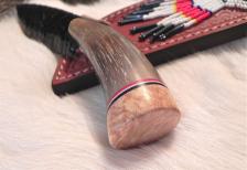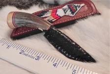 This cute little combo would make any guy or gal happy on Christmas. A quality “tooled” leather sheath with a beaded thunderbird motif protects & carries this buffalo horn knife. The handle is capped-off with spacers & a burl maple pommel. A nicely-knapped black obsidian blade is sharp & rounds out the piece. All is tightly glued together & buffed to a perfect sheen. A smaller, more affordable knife set. PRICED TO GO FAST! ($6.00 should cover most of the shipping & ins.). |