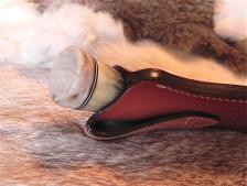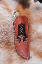 This is cute little combo would make any guy or gal happy on Christmas. A quality “tooled” leather sheath with a black & silver bead patch, protects & carries this buffalo horn knife. The colors here coordinate very nicely - between knife & sheath.The handle is capped-off with spacers & a handsome piece of Corian - (kitchen counter top material). A nicely-knapped white carrara glass (antique) blade is sharp & rounds out the piece. All is tightly glued together & buffed to a perfect sheen. A smaller, more affordable knife set. ($6.00 for the shipping). |