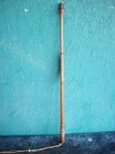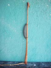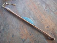 based on the 9000 year old atlatl found in a cave in Nevada. black locust body with antler spur and large polished boatstone, both lashed with deer sinew. the handle is wrapped with rawhide coated in hide glue and the wrist thong is deer hide lace. a classic and elegant look and well balanced performer. |