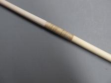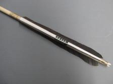 This arrow is a close copy of some in the Smithsonian that were collected by Maj. Stephen Powell on the Feather River in CA circa 1876. This could be a Konkow Maidu arrow or possibly a Pit RIver Shasta Atsugewi arrow as Powell collected over a fairly wide area in Northern CA. The main shaft is made of a shoot of syringa and the 7" fore shaft is made of service berry and is snugly fitted into the main shaft with a mortise joint wrapped with sinew. The stone side notched point is made out of red rhyolite set into the notch with pitch and sinew lashings. The cresting is white diatomaceous earth with a spiral banding of dark green pigment in the center made of earth paints and pigments. Fletching is peacock wing feathers which closely resembles the raptor feathers used on the original. arrow and are lashed with sinew and glued down with hide glue. |