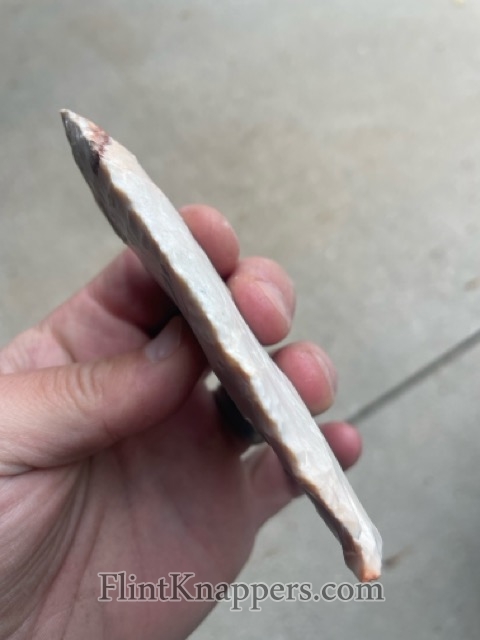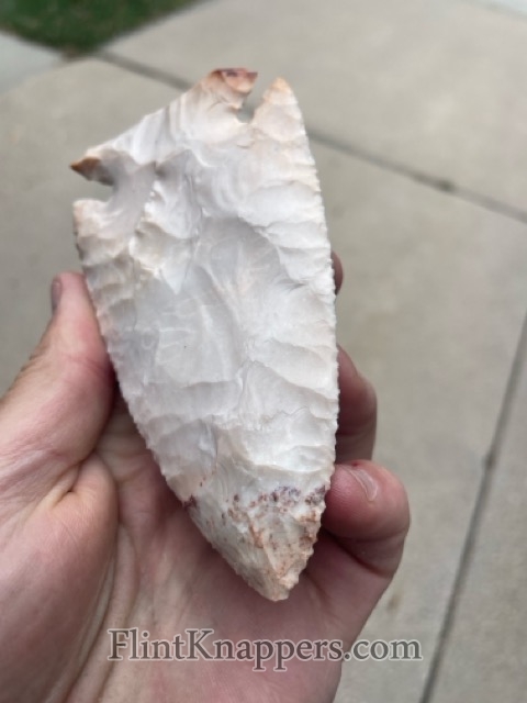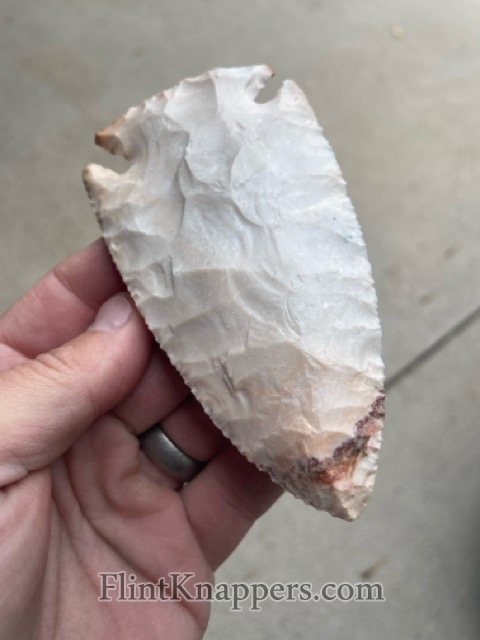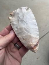 A Northern Side Notched point. Made using a nice variety of coral. The point measures 3 9/16” x 1 7/16”. |