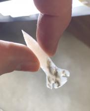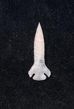 An Agee point made from a nice piece of novaculite. The tip is faintly pink and the base is grey and white. Fine flaking. |