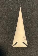 This corner notch style point is made from translucent pinkish white novaculite. The notches are thin and deep, slightly asymmetrical. |