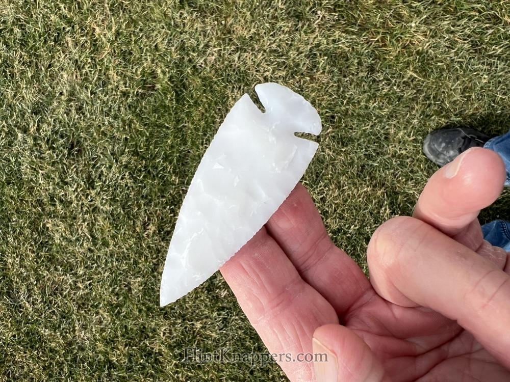 A very nicely made Dovetail point that was made from a flake of white Novaculite material, has deep notches too. |