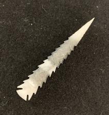 This Hohokam style point is made from an interesting piece of alternating black and translucent grey giving a banding effect. A very long point and challenging point style to make. |