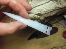 There is awesome micro serration along this 4 1/2 inch long ishi made from poka dot agate.