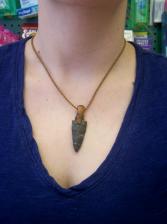 This necklace has a 1-5/8" Onondaga point hafted to a piece of river cane with Dog bane bark fibers. The pendant is 2-1/4" overall and is strung on a 25" cord of hand twisted Irish linen. This cord was waxed....I boiled it off for a softer feel. A very old African brass bead makes this necklace adjustable.