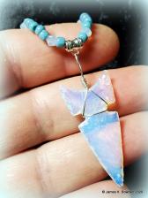 This necklace almost glows with a jelly like opalescence.  The arrowhead takes on different colors depending on its lighting and background.  Worn against black clothing it displays my favorite, a transparent, opalescent blue!