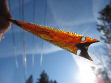 This pretty point is made from a nice piece of orange banded Montana agate with black in the tip and the base. Its made like some of the famous Crump Lake side notch points from Warner Valley in SE Oregon. Long and skinny with key hole notches and serrations with long 'fox ear' back barbs. Very pretty when held up to the light. My back still aches from being hunched over working on this one for so long! |