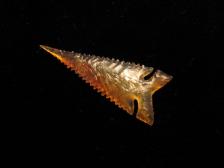 This little beaut is made out of orange banded agate. I modeled this on an original old Wintu point that was made just like this one with a needle tip, serrations, and deep expanding notches. They reall did make and shoot points like this one. |