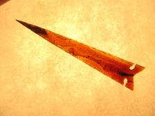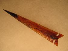 This long skinny Wintu style point is made from a particularly nice piece of orange Montana Agate. It has orange colored swirls and black specks in it along with a black colored tip. This quality and color of Montana agate is hard to come by but when I get it I try to do it justice. The third photo is a back lit one to show the pattern better that i did on my light table. |