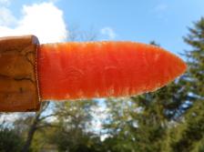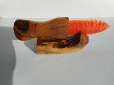 This Dagger type piece is about 8 inches long. The 4 inch long blade is of Orange Fiber Optic Glass, which is nicely shaped, flaked and sharpened. The Spalted maple handle is 4 inches long, has unique wood grain, with a dark knot near the end of the handle. Base is of a cradle made from the same piece of Spalted Maple which produced the handle. Price includes the Knife, Base and shipping to your USA address.