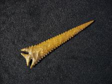 Slender Snake River Dart point made from golden colored Oregon jasper. A couple small clear agate streaks in this one. |