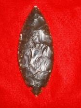 Here is a large Turkey Tail point made from Texas Rootbeer Flint. While originals were generally made from Hornstone, this one is still a beauty. I even left a bit or cortex on the base and tip to show that I used the whole length of the orignial material. It's thickness is 8mm at the thickest area! It also if very translucent when held up to the light and reminds me of Knife River Flint. |