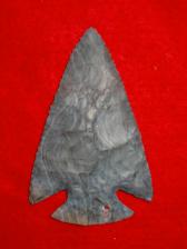Snyders points were a Woodland era point found in the midwest. The very best originals were made from Burlington Chert and Flint Ridge Flint. Here I offer a very nice Nether's Flint Ridge Snyders point replica. It has beautiful lines running through it and a very nice flake scar pattern on this thin piece. |