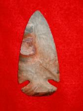 If you like Dovetail points, this one is a must have. It's made from Nether's Flint Ridge that I purchased from the famous knapper Roy Miller. It's got a lot of color and a lot of bold character with the inclusion on the right. A difficult piece of stone to knap, but this one turned out great. |