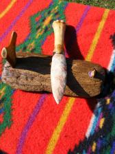 Late Paleo style blade percussion knapped from Flint Ridge then hafted into a deer leg bone, set with epoxy and tied with real deer sinew, then a coat of Danish oil to give the piece an old look, The base is WV Driftwood with a Caribou antler fork,,,, This is a Beautiful display that would make a Great Christmas present................... $12 shipping and Insurance |